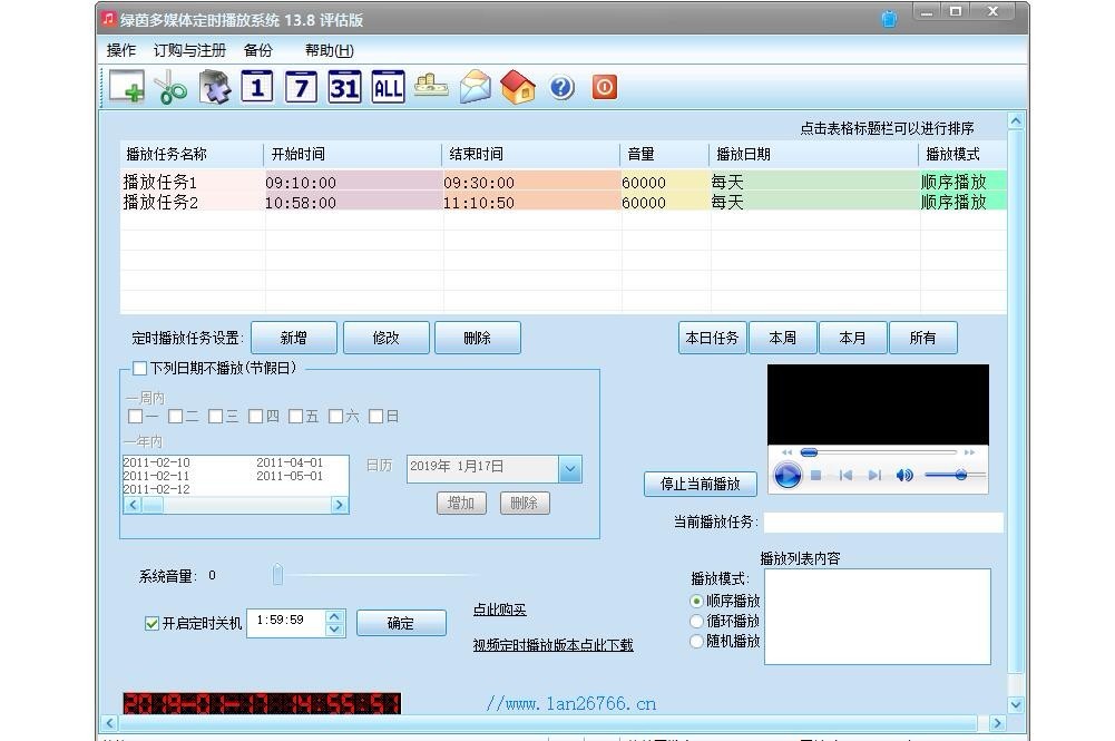 全自动定时播放软件,可以自由设置定时播放的音乐、视频,定时播放功能---系统可按企业、学校等设置的时间表通过本软件定时播放背景音乐、铃声、电影、广播操、眼保健操、国歌、预备音乐铃、上下课音乐铃、下课音乐铃、起床号,以及新闻、英语教学节目等其他自选广播音乐和节目, 可以设置24组播放列表。