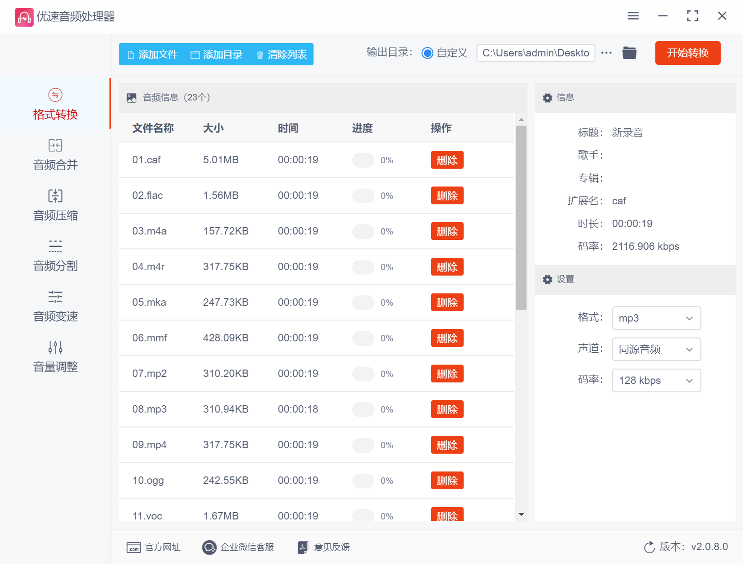 支持MP3、wav、ogg、flac、mp2、m4a、m4r、ac3、wma、aiff、aifc、caf、aac、ape、mmf、wv、au、voc、3gpp、mka、mp4等音频格式的相互转换。