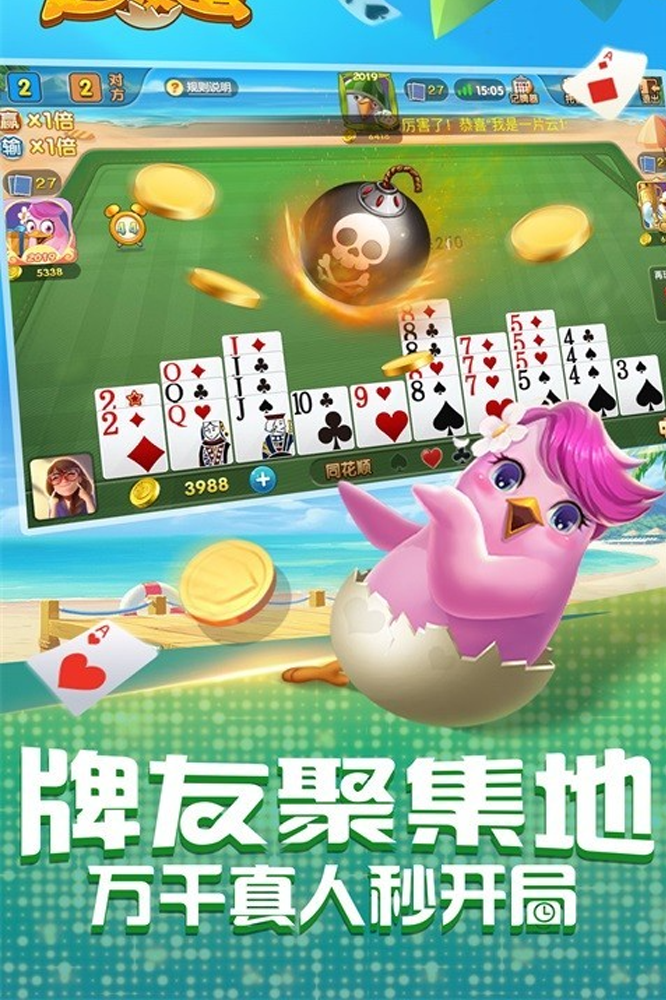 清新的游戏界面风格,欢快的背景音乐,丰富趣味的同花顺、钢板等特色动画