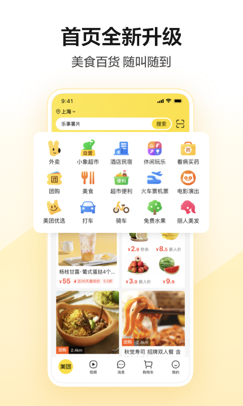 吃喝玩乐全都有:美食精选、外卖订餐、酒店预订、旅游团购、电商品牌特价、机票打折、电影特价、打车出租车等团购实惠根本停不下来!