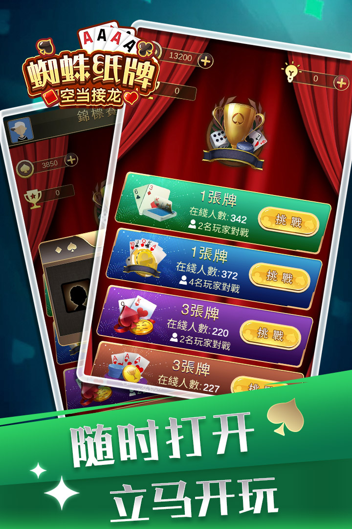 【手机端软件,需要安装游戏助手运行】 蜘蛛纸牌分十列排列,每列的顶牌正面朝上,其余的牌正面朝下。牌叠放在玩牌区左上角,要想赢得一局,必须按降序从 K 到 A 排列纸牌,将所有纸牌从玩牌区移走。在中级和高级中,纸牌的花色还必须相同,在不能移动纸牌时,可以单击玩牌区底部的发牌叠,就会开始新一轮发牌。全部牌移动完成时就会获得相应的分数奖励。