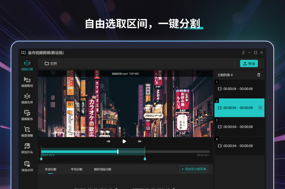 视频剪切、视频分割、视频合并、视频加水印、视频添加音乐合并、视频配乐、视频美化;金舟视频剪辑软件是一款简单易上手的视频剪切合并器,软件支持视频分割、视频合并;视频分割功能支持多段视频分割导出(支持手动精确输入需要截取的时间段)、视频画面任意截取、可自定义添加音频合成、视频配乐 画面调整、添加片头封面;为视频处理用户带来便利。 功能特点: 1.拥有视频剪切、分割、合并、添加配乐、画面调整、添加片头、添加水印等7大功能; 2.功能分类明确,界面一看就懂,一键导出处理视频; 3.支持添加背景音乐,可设置音乐循环,调整音量大小; 4.支持增加多个文字水印、图片水印、位置自由决定,想加哪里