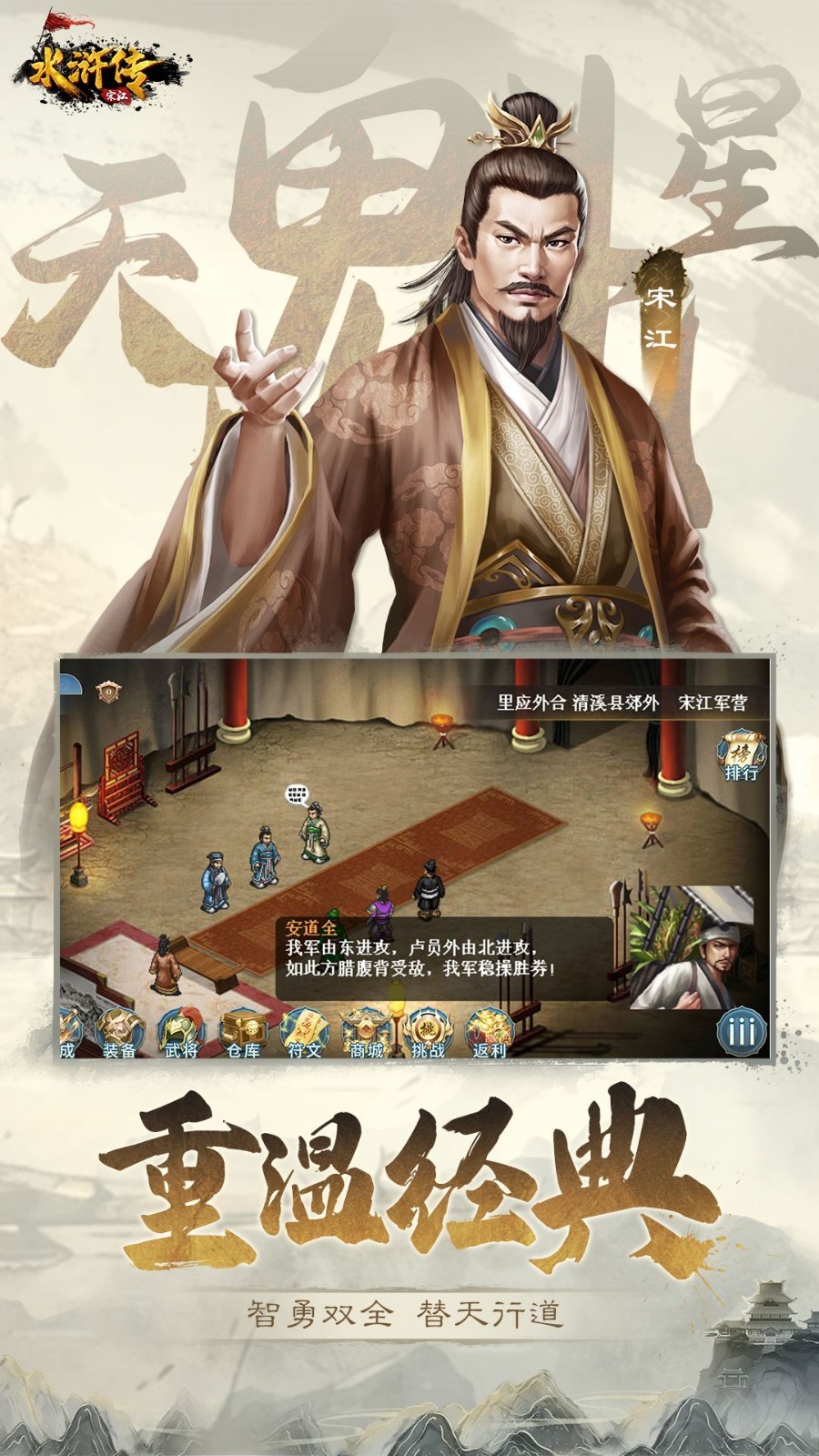 【手机端软件,需要安装游戏助手运行】 这是一款以《水浒传》为题材的回合制战棋类游戏,游戏中以宋江为主角率领107个好汉,通过一系列反抗压迫、英勇斗争的生动故事,揭示了当时的社会矛盾,暴露了封建统治阶级的腐朽和残暴,揭露了当时尖锐对立的社会矛盾和“官逼民反”的残酷现实。