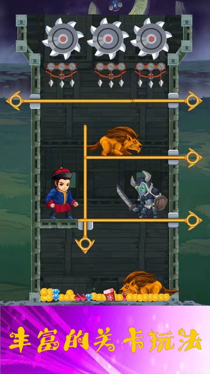 【手机端软件,需要安装游戏助手运行】 竖版地图物理特性的解谜策略游戏,你需要在一个封闭的房间里面挑战多种多样的关卡,凭借高超逻辑和策略来通过考验,关卡中存在水、岩浆、怪物和弓箭手和BOSS,少年必须不断的拯救漂亮的公主,收集宝石,同时保护自己的安全。少年也可以与心爱的公主一起建造属于自己的美丽家园。
