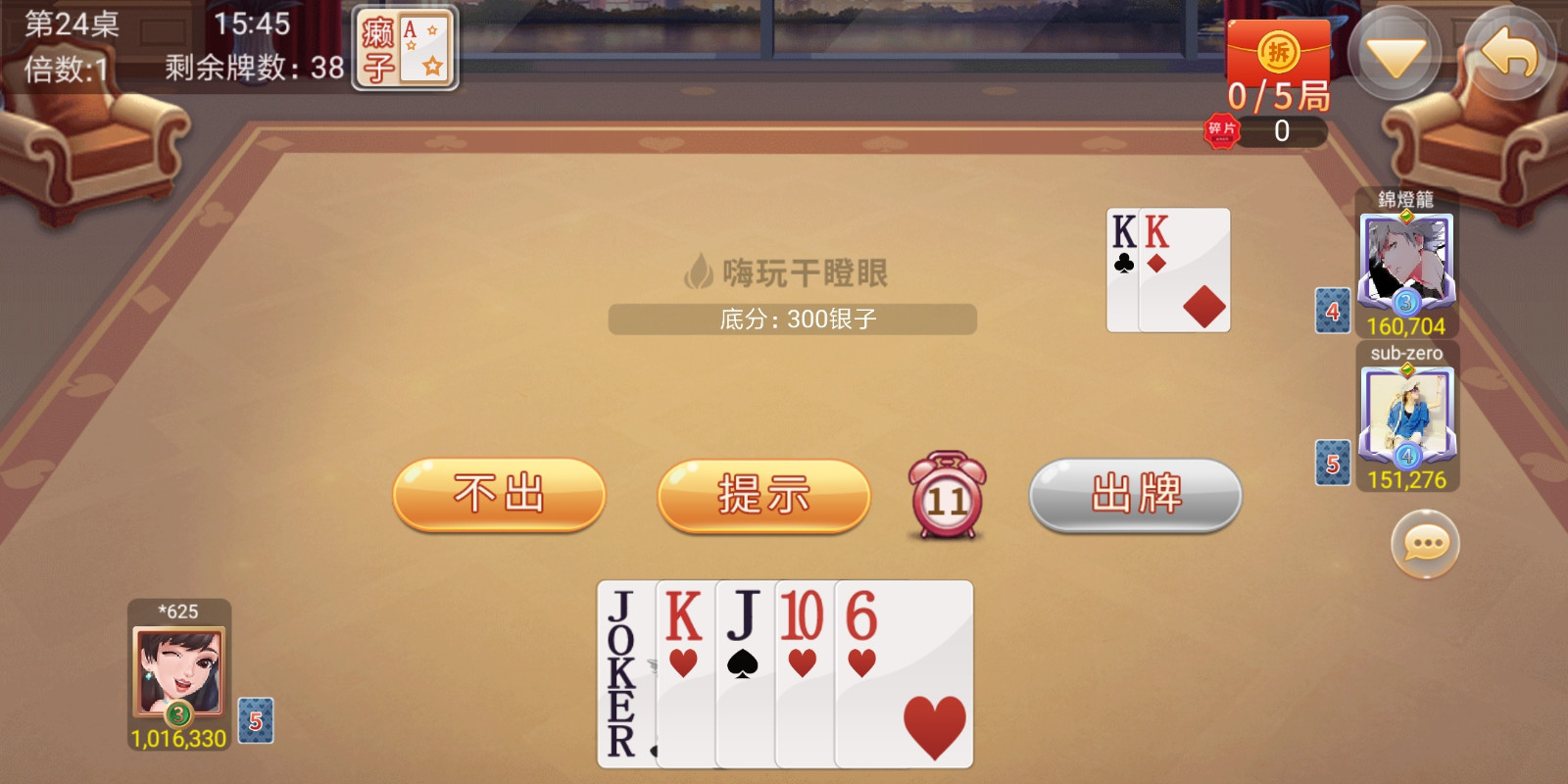 【手机端软件,需要安装游戏助手运行】 《干瞪眼》是一款比斗地主刺激 10 倍的扑克牌游戏,3 - 6 人均可玩,牌局命运变幻莫测,随时有可能突然胜利或者突然输掉