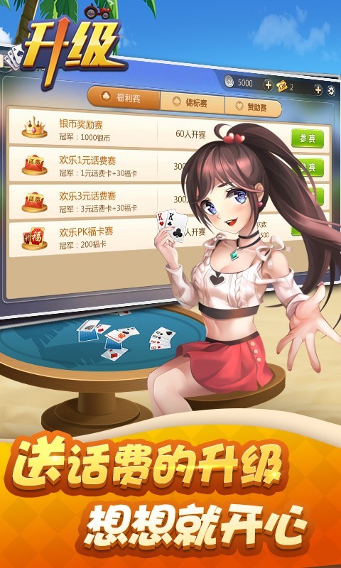 【手机端软件,需要安装游戏助手运行】 升级是国内非常盛行的一种 4 人扑克牌游戏,可以选择一副牌、两副牌或者三副牌进行。打一副牌时,也称为 "40 分 " 或 " 打百分 " ;打两副牌时,也称为 "80 分 " ,还有的地方也有叫 " 摔小二 " 、 " 拖拉机 " 等。该游戏由4位游戏者参与,根据屏幕显示位置,分别为左、上、右、下四方。左右方合作与上下方对抗,看哪一方的级别升得第一。