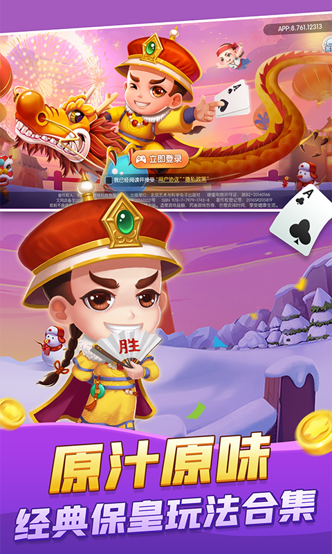 【手机端软件,需要安装游戏助手运行】 保皇起源于我国山东青岛,类似于够级而 5 个人玩,由 2 方玩家:保皇派(皇帝、侍卫)与平民三人进行对抗,目的是 1 方成员尽可能早出完牌。
