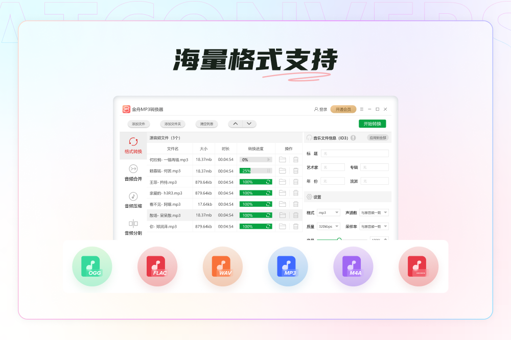 音频转换,音频合并,视频转音频,音频分割,金舟MP3转换器是一款多功能的音乐音频转换软件,集合了音频格式转换、音频合并、音频分割、视频转音频,调整声音大小等多种功能,支持的常见音频音乐格式有:mp3/mp2/wav/wma/m4r/m4a/ac3/aac/ogg/flac/aiff;转换三步骤:1.添加需要转换的音频文件,2.选择需要输出的音频格式,3.点击开始转换即可。 软件特点: 1.支持批量转换、合并、视频音频提取; 2.支持转换时保留原文件标签信息; 3.支持显示ID3标签; 4.以不生成临时文件的方式高速转换; 5.可以将你的音乐文件的格式转换为你所需要的格式,包含了所有的音频格式