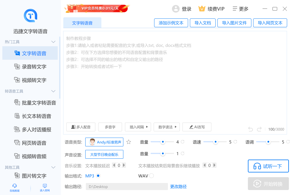 迅捷文字转语音一款功能齐全的文字、语音智能转换软件。提供多种人声背景音乐,轻松将文字转为语音,还具备多国语言精准翻译,视频转文字和音频,图片文字识别等功能。实现精准识别、智能断句、语音变速、批量处理。适用于商场店铺广告、公共场所播报、视频后期制作、有声小说阅读等场景,是办公学习的配音助手