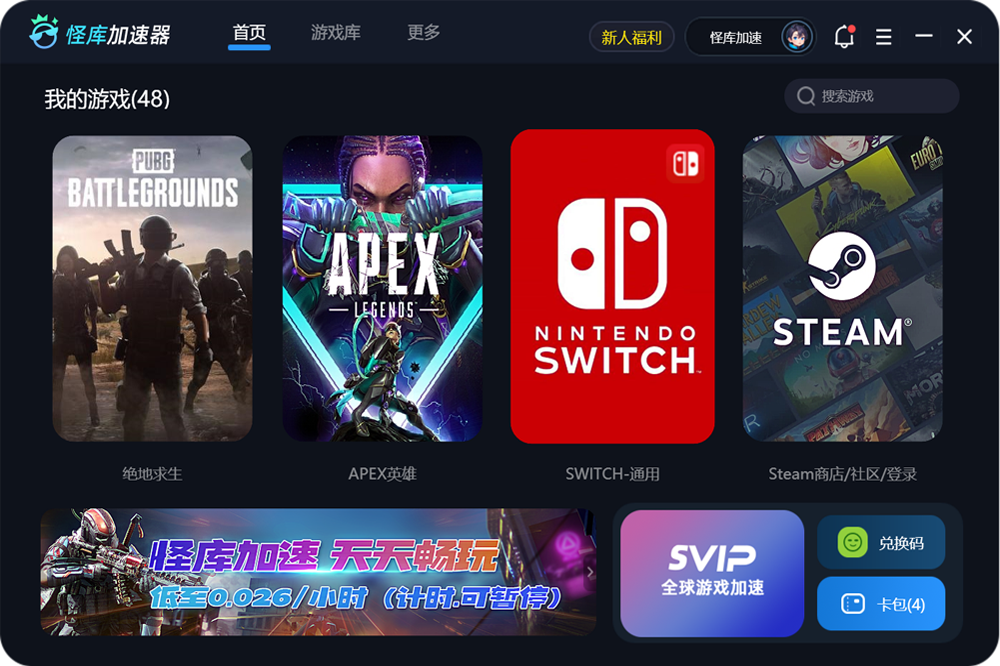 怪库加速器新版本上线,凭借稳定、低延迟、超高性价比的强大优势,更是为多个电竟俱乐部训练比赛提供专线加速无法。支持国内外海量热门游戏:黑神话悟空、steam平台、英雄联盟外服、鹅鸭杀、PUBG(绝地求生)、英雄联盟-云顶之弈、原神、DOTA2、CS2、Apex英雄、失落的方