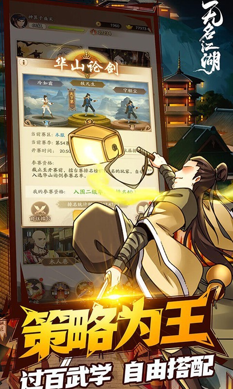 【手机端软件,需要安装游戏助手运行】 《无名江湖》是一款以收集百家武学为目标的放置类卡牌游戏。游戏讲的是玩家作为一个初入江湖的小虾米,在师傅的悉心教导下,一步步成为一代大侠的传奇故事。玩法主打武学卡牌的策略搭配与武侠氛围的体验,喜欢策略玩法与武侠题材的玩家不容错过。