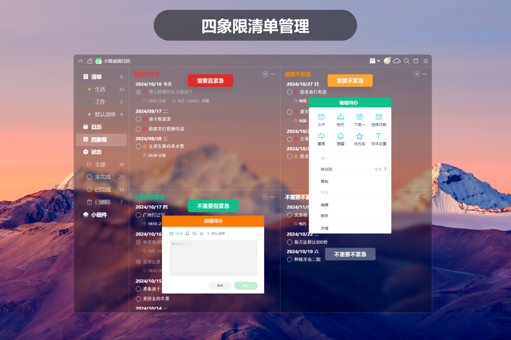 小智桌面日历(原小智ToDo),让时间管理简单而有效!撰写你的专注清单,任务管理得井井有条! 小智桌面日历是一款适用于Windows、iOS、Andiord的软件,集日程清单(ToDo-List)、日历、桌面小组件、自定义提醒/重复、多端同步、个性化设置等多种实用功能于一体,专注量化待办清单、日程管理和事项提醒。抛弃纸质笔记本、记事本,小智桌面日历是你高效办公、目标/项目管理、习惯养成及便捷生活的贴心智能助手。 你可以在电脑桌面创建桌面日历,它是一个迷你悬浮窗,始终悬浮在电脑桌面,提示你每日、每周、每月重要的行程安排。配套的天气、时间组件可以快速查看当下天气、时间情况。