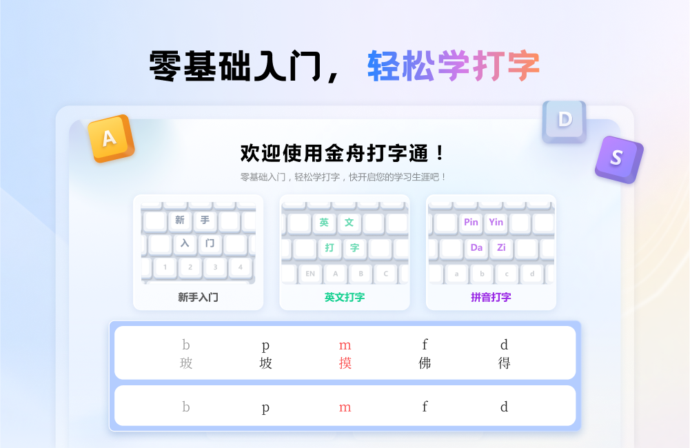 1.新手入门:对打字基础进行系统性知识学习,包含认识键盘、打字姿势、基础练习等,循序渐进带领用户进入打字的世界;