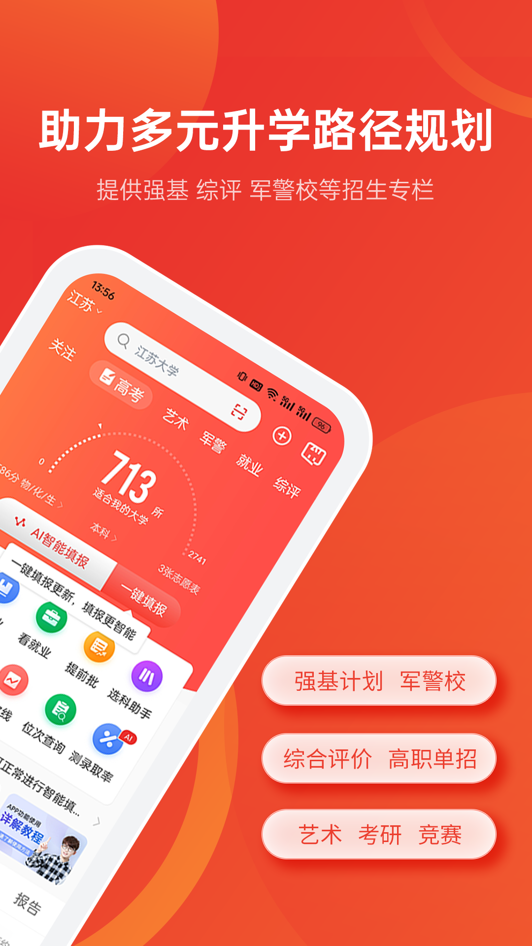 优志愿专注于为广大考生提供多元升学规划服务,覆盖30省市,提供在线AI高考志愿填报、美术志愿填报、军警校、强基计划、综合评价、高职单招、竞赛、考研、就业等全方位服务。迄今为止,优志愿已累计服务1800万+考生,帮助他们成功实现升学梦想,成为考生和家长们都信赖的教育APP。