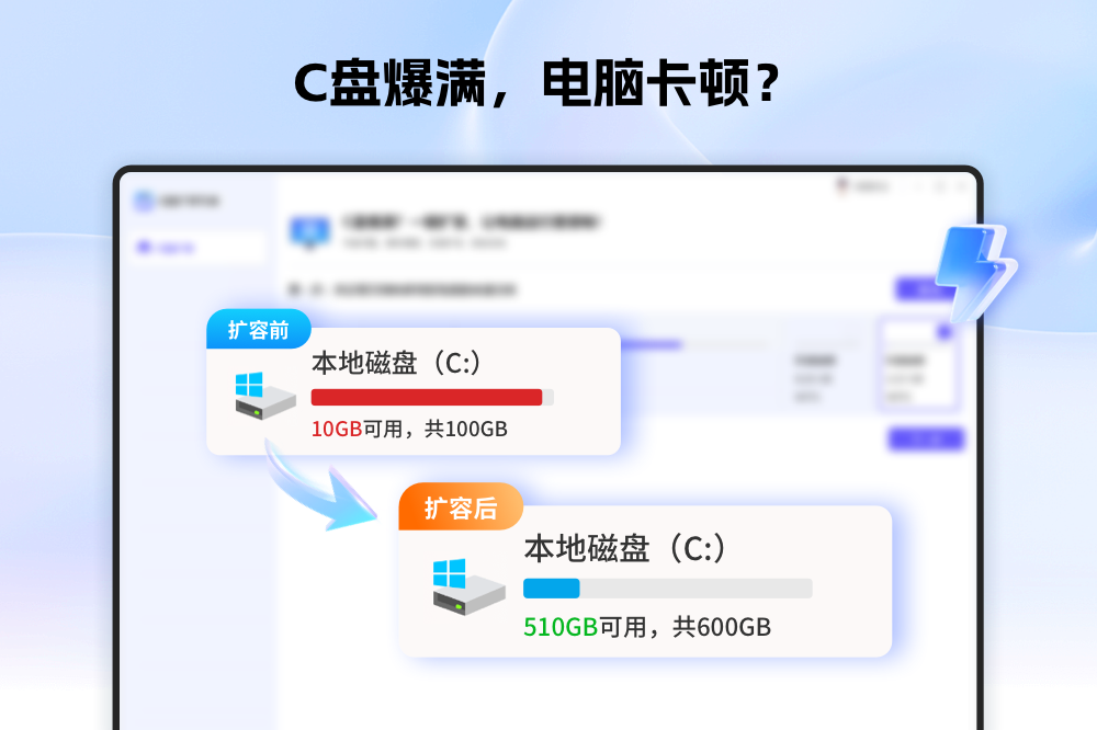 C盘爆满导致蓝屏、卡顿? 幂果C盘扩容助您轻松解决!专业硬盘分区工具,只需简单几步,就能安全地将其他盘的空闲空间“挪”给C盘,快速缓解空间压力,告别系统异常!