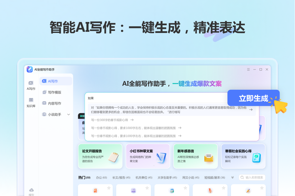 ai写作,ai创作,ai写作助手,写作ai,写论文,ai写文,写公文,写日报,写周报,写报告,写小说,写剧本,年度工作总结,述职报告,写软文,小红书种草文案,爆款标题,续写,改写,润色,扩写,缩写,写大纲;AI写作全能大师是一款专门打造的AI智能写作助手,帮你轻松应对各类创作场景。无论是写小说论文、问题解答、新闻咨询、自媒体营销文案、工作总结、作文批改润色,还是节日祝福,我们都为您提供了丰富多样的场景写作助手,AI即刻为你生成流畅、优质的文本内容。