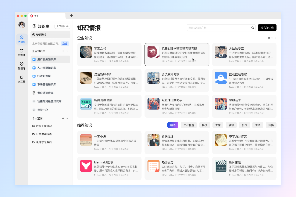 360纳米AI企业版为用户提供国内外优选大模型,帮助企业实现知识库内容采集、创建、管理,为用户提供人才税法/办公类等智能体,同时支持智能体自编排,可帮助企业实现团队、员工AI使用的全面监测和能效优化。