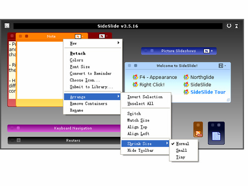 让你可以为程序,文档和文件夹,使用一个可以隐藏在你的计算机屏幕边缘直到使用你的鼠标将其激活才显示出来的迷你桌面来创建一个定制的运行面板。除了快捷方式之外,该软件还提供了提醒(带有提示音)和便笺以及剪贴板捕获等功能。你可以简单地拖拽快捷方式到工作区,创建用于组织你的内容的容器并且可以使用背景图像和颜色完全定制其外观。创建的容器和记录可以按层次安排,可以通过拖拽方式收缩/展开以及自由地移动。其它功能包括允许你同时开始运行多个程序的组运行功能的支持,隐藏和显示快捷方式,图像显示等。