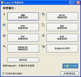 TimeLeft是一个运用了Winamp的外皮,进行倒计时、秒表的程序。TimeLeft可以计算目前到下一个目标(年、月、日、时、分、秒)、或是距离目标过了多少时间;而这个目标可能是年底、生日或是你目前进行计划的截止时间。你可以自定警告用的声音、提示文字、图标等等。