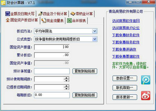 商易财会计算器是一款财务人员专用计算器。主要功能:金额及日期大写、四金及个税计算(养老保险金、医疗保险金、失业保险金、住房公积金、个人所得税)、滞纳金计算、固定资产净残值计算、固定资产折旧计算(平均年限法、工作量法、双倍余额递减法、年数总和法)、合并报表(适用于对各种财务报表进行合并)。