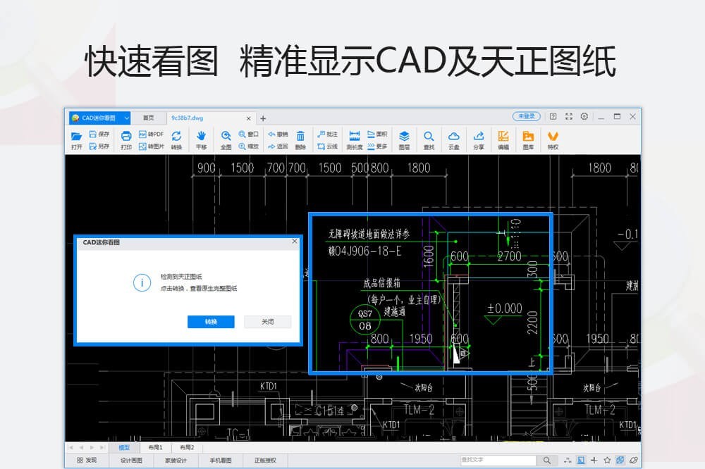 CAD迷你看图,快速看图、轻松编辑的CAD看图软件! 超强编辑功能:直线、矩形、插入文字、修改文字、复制、粘贴、移动、删除。 智能测量:长度、角度、面积、半径、弧长等十余种测量功能供选择。 效率转换:支持天正图纸转换,PDF转CAD、批量转PDF、批量转图片、批量转CAD版本。 批量打印:自动识别图框,轻松完成批量打印。