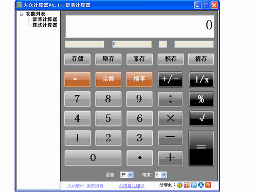 目前由语音计算器和算式计算器(科学计算器)两个子功能组成,后续将开发个税计算器、房贷计算器、存贷款计算器等。【语音计算器】常用的十进制加减乘除四则运算,全按键语音,支持小键盘输入,实时显示输入操作数和运算符号,再也不会为计算过程中被打断而忘记算到哪需要从头开始而烦恼。【算式计算器】直接输入如3!+sin(ln2 * lg45^6)的复杂算式,支持三角函数、阶乘、对数、幂、根运算,对输入的算式进行智能识别、排版、着色处理,验证出错则精确指明错误位置和原因,正确则直接运算结果。注意:该软件运行须 .NET Framework 2.0运行库支持,运行loader.exe自动检测及安装此运行库。