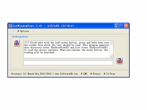 GetWindowText 是一个小巧便携的软件,使你能够查看窗口文本。只需按住鼠标左键拖动GetWindowText 的图标然后在你想要读取的窗口文本的地方松开,便得到了窗口控件中的文本内容。它几乎能读取所有的标准窗口控件内容,例如: Edit, Static, Groupbox - Controls,等。也支持目录控件(SysTreeView32) 和列表 (SysListView32)的内容。并且,它也能查看密码框查看器,完全能够替代星号密码查看器。