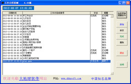 本软件用于工作日程记录和提醒。每个人每天都要做许多工作、办许多事,事情越多就越容易忘记,有些事再忙也不能错过的,错过就难于弥补,因此就很需要这么一个工作日程提醒系统,可以用于记录每天要做的事:比如:办业务、开会、交费、接待、约会、生日、赴宴、年检、签合同、买车票、购物等等。每天一打开电脑就会提示今天要做什么,如果今天没做完,明天再提醒您,一直提醒您做完为止。每项日程设置音乐提醒时间,提前3分钟就是用音乐提醒您,比如您正在忙于工作,开会时间到了,马上就会响起音乐提醒,相隔一分钟提醒一次,共提醒2-3次。本软件是免费软件,是大地球软件公司献给大家的非常适用的精品软件。