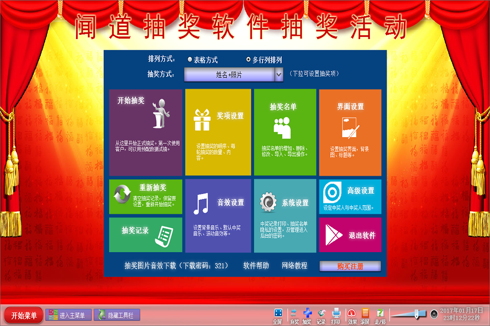 闻道全能抽奖软件是一款照片、姓名、号码抽奖的软件。适用于晚会、年会等各类集体抽奖活动。绿色版方便将配好的软件拷贝到抽奖电脑上使用。