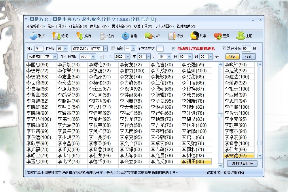是一款不用联网也可以使用,真正按周易生辰八字取名的软件。取名重要的2个因素就是平衡生辰八字和五格数理,五格数理对于人的性格影响多一点。平衡生辰八字才是影响人一生运程的重要因素。软件可以根据你宝宝的出生时间为你宝宝量身打造一个完全平衡你宝宝生辰八字的,饱含祝福的,好听而又高雅的吉祥好名。除经典取名功能外,还有诗词成语取名,取小名,在线测算,育儿知识,取名知识和少儿动画欣赏等功能。