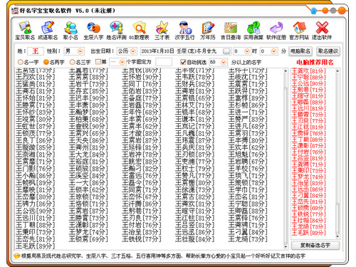 宝宝取名必备软件。1.软件可一直不停地生成非重复名字(直到用户挑到满意的名字);2.然后自动根据五行用神(生辰八字),五格三才数理(姓名笔画)等现代学取名知识进行自动对每个名字进行评分, 然后给出名字的详细五行点评,五格三才解释;3.软件自动挑选评分很高的名字供用户参考。