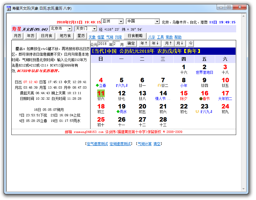 一款采用现代天文算法制作的农历历算程序。含有公历与回历信息,可以很方便的进行公、农、回三历之间的转换。提供公元-4712年到公元9999年的日期查询功能。其中-721年到1960年的农历数据已经与陈垣的《二十史朔闰表》、张培瑜的《三千五百年历日天象》、方诗铭的《中国史历日和中西历日对照表》核对。寿星万年历含有从公元前2000多年以前到今的基本年号,含有二千多个国内城市的经纬度,并且用户可根据自已的需要扩展经纬度数据,此外,本万年历还提供了历谱数据导出功能。