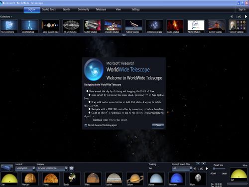 微软开发的桌面太空望远镜软件。用户可以观看太空各个星系、星球,也可以将任何地域的数据放大。微软表示要加入哈勃望远镜和多个环绕地球的望远镜,为用户提供更为准确的数据服务。当用户查看一个地域时,可以从不同的角度观看。硬件需求至少1GB内存,或Core 2 Duo 2G + 2GB内存,系统需求支持XP SP2和Windows Vista/Windows 7(推荐)。