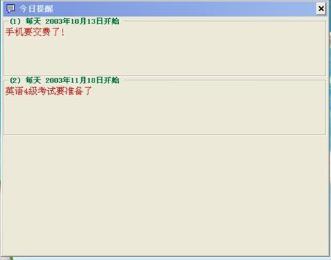 这是一个非常实用且功能全面的备忘提醒软件,无论是新历的,农历的,每天一次的,还是每年,每月,每周、每季的,只要把工作上和生活上各种各样需要提醒的事情录入到软件里,软件就会根据设定的时间自动给出提示