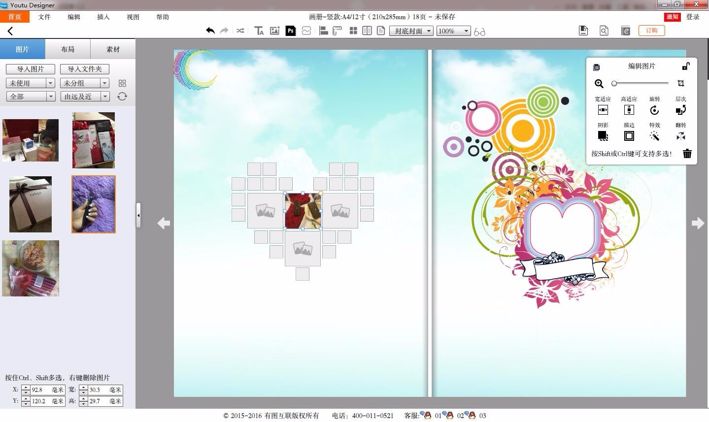 对于普通大众能开启自助创作旅,迅速完成平日无法想象的个性化画册(也称照片书)。对于爱好摄影和热爱创作的人来说,使用有图桌面版,内置各类主题的模板和海量的素材库,可以快速设计各种主题的摄影作品集和精美画册等,如果在我们的主题模板的基础上拖拽自己的图片和还可以快速的排版大量的文字,能大大提高您的设计完稿的效率。如果您想自己创意设计,可以选用内置的数千种版式布局以及数千种素材(背景,边框,装饰)。对于专业的平面设计师或专业市场人员不但能快速完成自己想要的商业印品,还能完成品牌传播和营销活动中所需的数字作品,无需学习那些专业制图软件,动画工具和网页制作工具,有图一站式帮你实现了从图文排版,动画制作以及一键发布成手机版,还提供丰富的模板和素材,大大提高了您的工作效率。