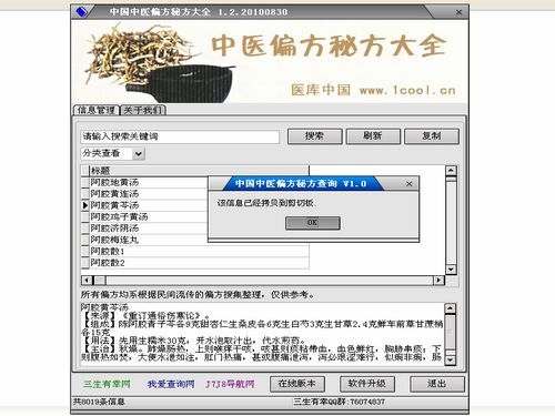 中医偏方秘方的查询工具。软件收集了众多的秘方,还有民间的土方、偏方、单方等,共8000余条,诚为家庭和医务工作者实用的参考工具。