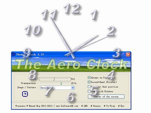 TheAeroClock是一个独特的透明桌面时钟。支持缩放、透明度和更换皮肤。基本功能:总的透明度,大小,设置,时钟的纹理或外观可供选择。