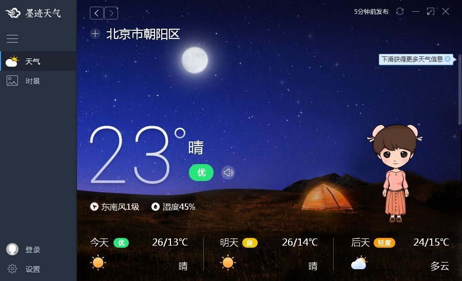提供详尽的生活信息及建议,包括:穿衣、运动、化妆、感冒、紫外线、洗车;即时查看空气质量,不仅仅关心天气,更关心空气;天气背景随天气情况变化,给你一目了然的天气信息;提供迷你窗口显示,看天气更加便捷。