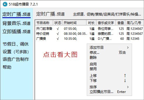 518超市播音软件,518谐音“我要发”,顶级超市广播软件,超市定时播音系统,超市语音播报软件。广泛用于商场、超市、健身房、游乐场、幼儿园、工厂。汇集优质中英文语音库,接近真人发音。含背景音乐、定时播、立即播三个不同优先级的频道。高优先级频道播出时,低优先级频道自动降低音量或静音,频道切换时带有淡入淡出效果。通过将电脑音频输出连接至功放,即可打造一套超市播音系统。