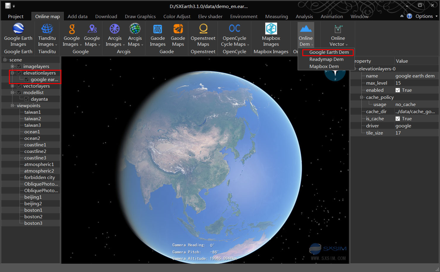晟兴地球SXEarth是一款免费的三维数字地球系统,也是一款GIS及3DGIS产品,可以用于虚拟现实、数字城市、数字交通、军事作战态势标绘、事故过程模拟、地理教育等行业。