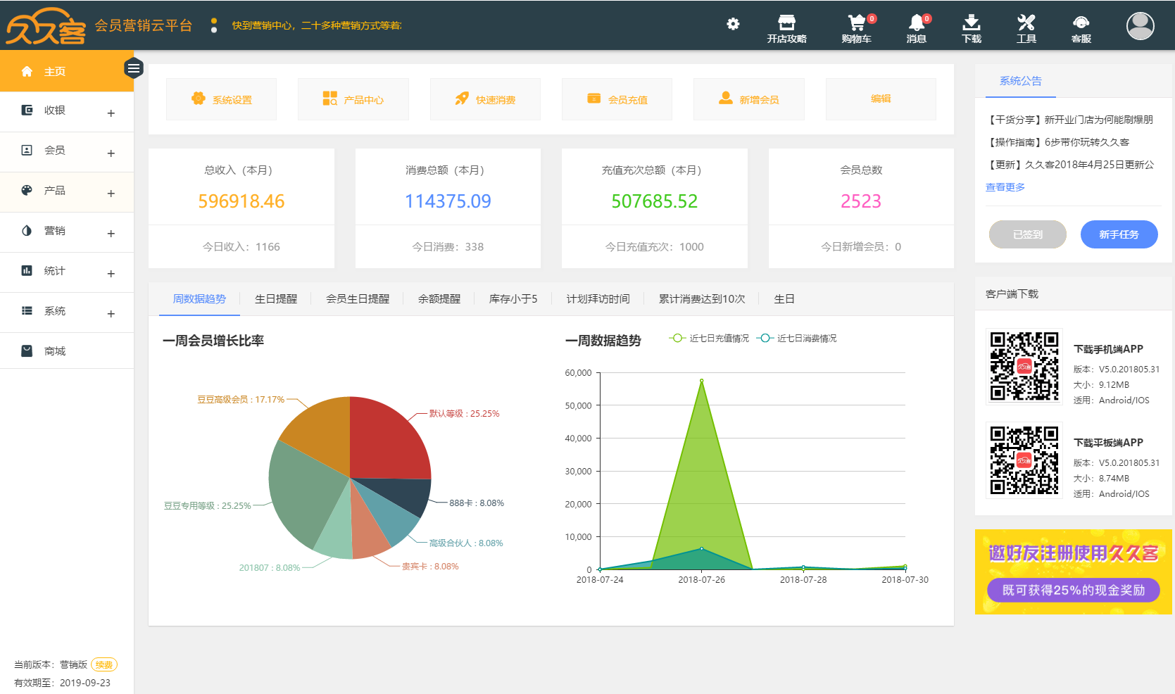 久久客连锁会员管理软件是一款功能强大,操作简便的会员管理系统。是店铺进行会员制管理、会员积分管理、会员消费管理、会员营销、结算收银必备工具。是采用SaaS客户端架构的一款适合单个及连锁店铺使用的会员管理系统,拥有短信群发、邮件群发、邮件备份、来电弹屏,库存管理、员工提成,生日提醒,库存提醒等方面功能。同时,本系统还支持多种支付方式和自定义字段,能够满足日常经营和各种营销需求。