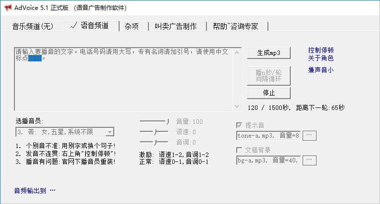 AdVoice,语音广告制作软件,广告录音制作软件,地摊叫卖录音制作软件,接近真人发音。可制作带背景音乐的语音广告(mp3),保存到U盘,然后插到音响上循环播放,用于门店的宣传促销。另外支持:间隔循环播音、提示音、文稿背景、插入停顿、语速音调、多声卡。