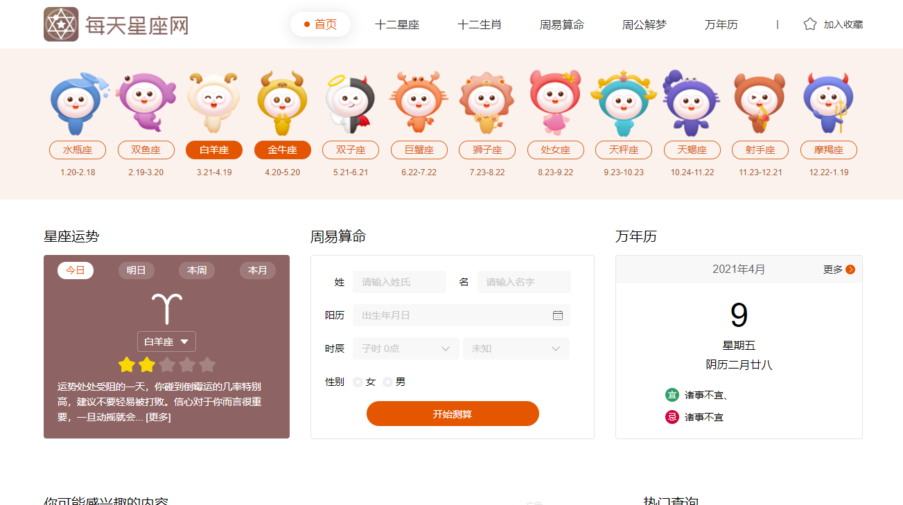 每天星座网致力于打造有趣好玩的星座互动平台,拥有十二星座查询,星座运势,12星座配对,星座日期查询,星座性格解析等服务,为星座爱好者提供全方位的专业星座服务。