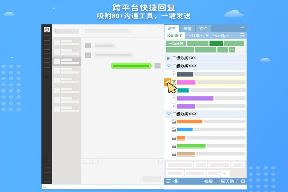 客服宝是一款跨平台快捷回复工具,让客服少打字回复快,解决客服工作中相同问题重复回复,打字又慢又辛苦的问题,还能大幅提升对话质量。将您的常用话术放在客服宝中一键回复,话术支持多人共享,电脑版和手机版的内容实时同步。