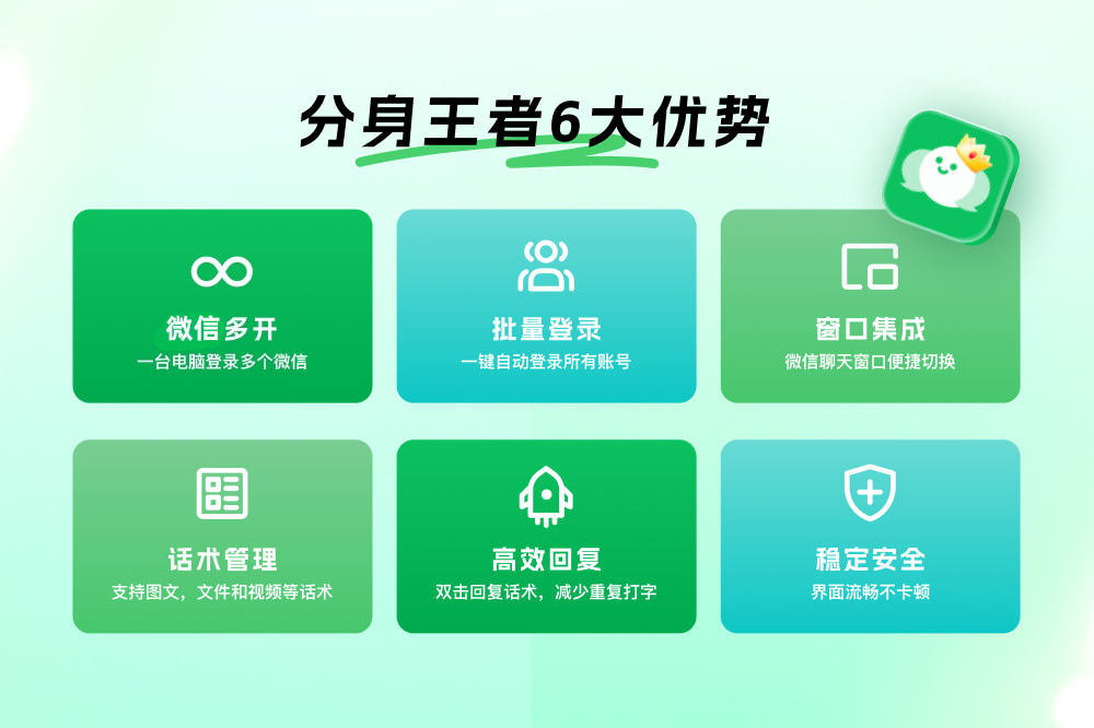 分身王者(微信多开,支持微信4.0以上)是一款微信电脑PC版多开工具,可以让用户在同一台设备上同时使用多个微信账号的功能(注:具体上限个数受电脑性能和微信风控影响);话术管理功能,可提升客服人员沟通效率,减少重复打字,帮助企业用更少的客服,服务更多客户。