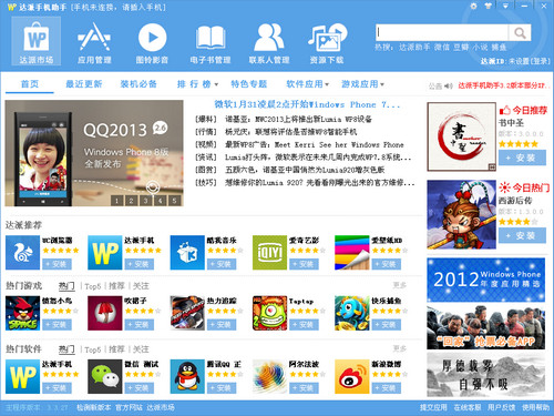 达派手机助手是国内优秀的windows phone手机助手,它可以个性化您的爱机,主要功能包括应用的下载与管理、游戏的下载与管理、歌曲的下载与管理、铃声下载与管理等个性化功能。