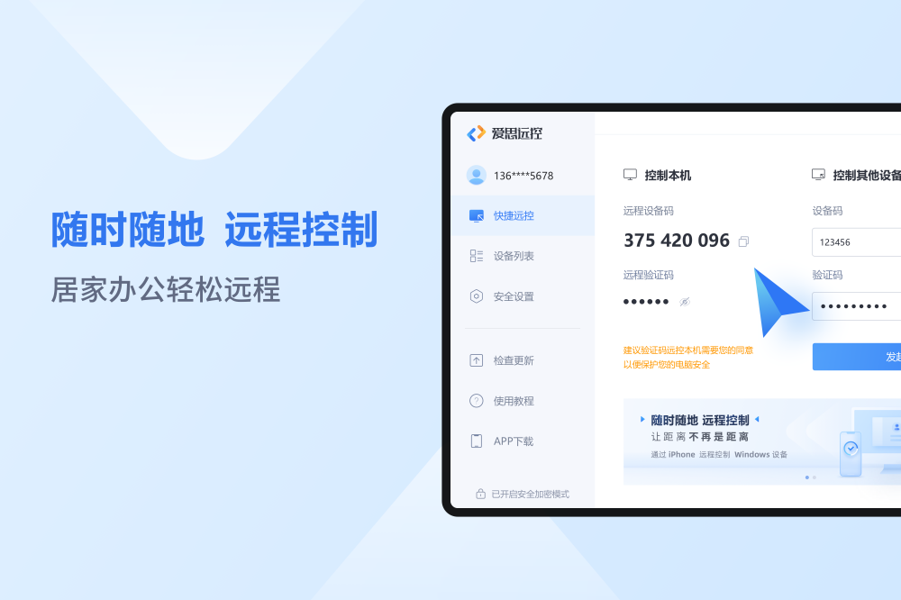 爱思远控是一款安全稳定的远程控制软件,由爱思助手专业团队打造,支持Windows设备之间远控,同时也支持iOS、iPad、Android手机设备与Windows主机设备之间远程控制。具有远程办公、远程管理监控电脑等功能。通过爱思远控,可以实现随时随地使用电脑或手机远控电脑主机,进行多台远程主机设备管理轻松解决不在电脑前无法控制电脑等情况。