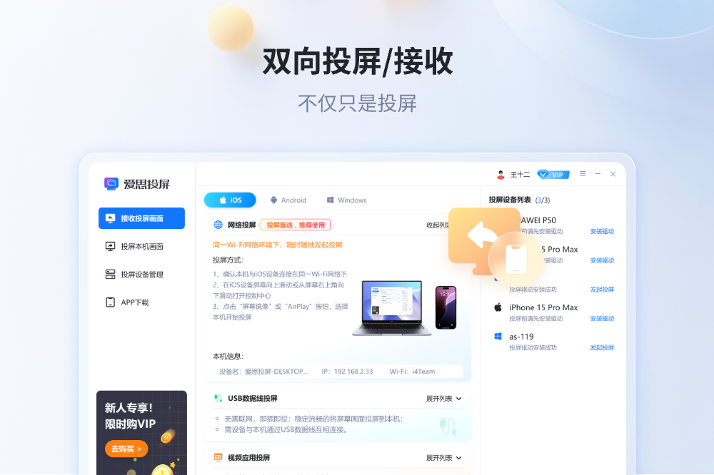 爱思投屏PC端是一款功能强大、操作简便的无线投屏工具软件。它能轻松将您手机(iOS/Android)、平板或电脑的屏幕画面与内容,实时投射到Windows电脑的大屏幕上,打破设备界限,实现高效便 捷的多屏协作,实现手机、平板与电脑大屏无线互联、高效共享的得力助手,让办公更便捷,娱乐更精彩!