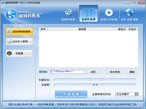 购买与咨询QQ:30947791,技术支持QQ:1992210234。一款多媒体转换工具。集成视频转换、音频转换、CD抓轨、音视频混合转换、音视频切割/驳接转换、个性文字/图片/画中画效果叠加于一体的优秀影音转换工具。其内置国际一流的解压技术,转换质量一流,同时支持各种CPU的MMX/3DNow/SSE/SSE2/SSE3以及全新多核技术等指令系统的全面优化,让您拥有更快速的转换速度。