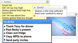 Stickies电子便利贴,让你再也不会忘记任何重要的事项、工作内容或是待办事项,甚至是一些小琐事。Stickies文件虽然很小,但其功能真是不赖。中文支持度极高,还可以把它当做一个小闹铃,时间一到自动提醒你。若你的同事或朋友也有安装Stickies的话,你们之间的电子小纸条还可以利用电子邮件或IP地址的方式,互相交流呢!其至把它当成一个留言的小纸条也可以唷!若你手上有PPC或Palm,并且有安装Stickies,你在外面用Stickies所记录的事项,还可以与PC上的Stickies做一个同步交换的动作。让你永远不用担在外面使用PDA所记录的事项,无法与计算机做同步交流的动作。